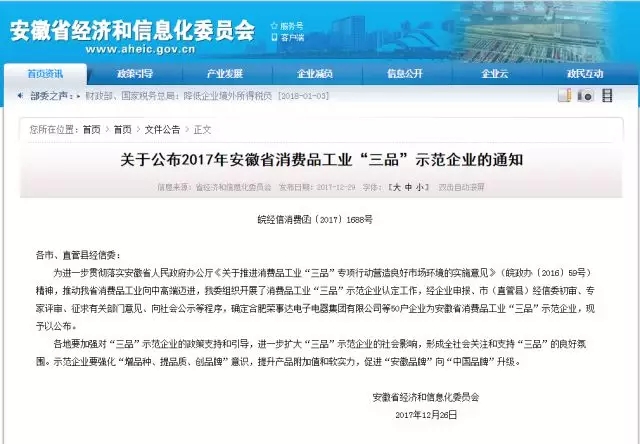 為推動安徽省消費品工業(yè)向中高端邁進(jìn),近日,安徽省經(jīng)濟(jì)和信息化委員會組織開展了消費品工業(yè)“三品”示范企業(yè)認(rèn)定工作,經(jīng)企業(yè)申報、市(直管縣)經(jīng)信委初審、專家評審、征求有關(guān)部門意見、向社...